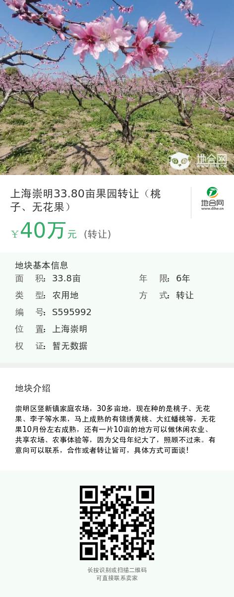 崇明区竖新镇家庭农场,30多亩地,现在种的是桃子、无花果、李子等水果,马上成熟的有锦绣黄桃、大红蟠桃等,无花果10月份左右成熟,还有一片10亩的地方可以做休闲农业、共享农场、农事体验等,因为父母年纪大了,照顾不过来。有意向可以联系,合作或者转让皆可,具体方式可面谈!